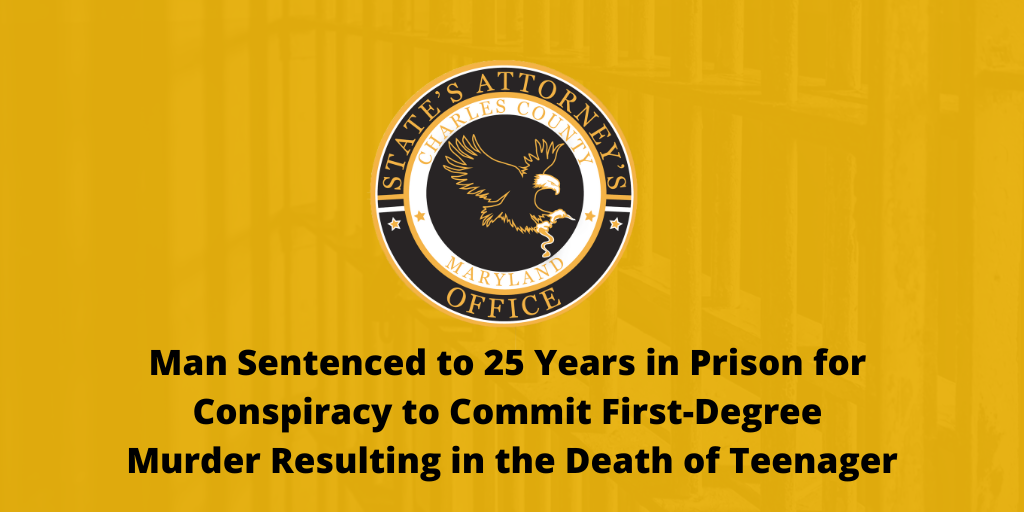 LA PLATA, MD—Tony Covington, State’s Attorney for Charles County, announced that on Friday, June 27, 2025, Charles County Circuit Court Judge William R. Greer, Jr. sentenced Ricardo Kevon Colbert-Lyles, 24, of Waldorf, to 25 years in prison for Conspiracy to Commit the First-Degree Murder of Aden Christopher Garcia.